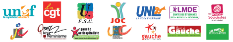 Union Nationale des Etudiants de France (UNEF), Confédération Générale du Travail (CGT), Union Nationale Lycéenne (UNL), La Mutuelle des Etudiants (LMDE), Mouvement des Jeunes Socialistes (MJS), Jeunes Communistes (JC), Jeunes Radicaux de Gauche (JRG), Osez le Féminisme (OLF), Gauche Anticapitaliste (GA), Union des Etudiants Communistes (UEC), Gauche Unitaire (GU), Parti de Gauche (PG), Jeunes Ecologistes
