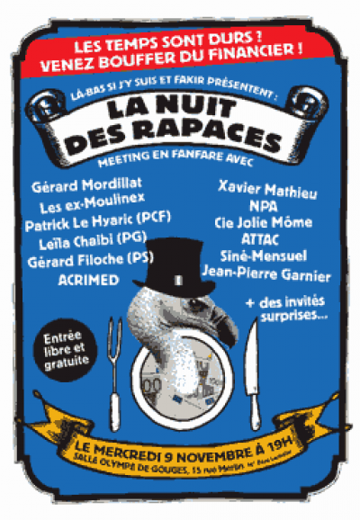 C’est bien difficile de les départager, nos douze Gens Pires, livrés à la vindicte populaire lors de notre Nuit des Rapaces. Plus de mille personnes (« 1 035 », très précisément, d’après le gardien, plus deux cents refoulés à l’entrée – de peur que la salle Olympe de Gouges ne devienne aussi célèbre que le stade du Heysel) huent tour à tour les Michel Pébereau, Mario Draghi, Bernard Arnault, Jeffrey Smith, Maurice Lévy, Michel Destot, Manuel Barroso, Maurice Lévy, Marc Ladreit de Lacharrière…
