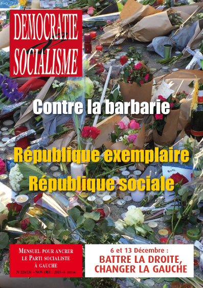 P.6 à 8 Pour battre la droite, changer la gaucheP.8 Les Pays de la Loire à gaucheP.9 Le bilan de la droite en AlsaceP. 10 à 12 De quoi le Front National est-il le nom ?P.12 Nous ne cèderons pas !P.13 à 15 “Compte personnel d’activité” contre “Sécurité sociale professionnelle”P.16 Plus que jamais, les fonctionnaires indispensablesP.17 TAFTA : Stop ou encore ?P.18 à 21 Pour la République exemplaire ; Nous sommes unisP.22-23 Ce code qu’il faut défendre -CQFD-P.24 Déchéance de la nationalitéP.25 Existe-t-il un instinct collectif de survie ? (2)P.26-27 La conférence de ZimmerwaldP.28 à 30 Novembre-décembre 1995 ou le réveil des salariés françaisP.30-31 Femmes exiléesP.32 Syrie : une intervention problématiqueP.33 Unité de la gauche portugaise, espoir populaireP.34 Post-it Palestine : Une jeunesse acculéeP.35 Suisse : L’UDC, première force national-populiste d’EuropeP.36 Bernard Grangeon (1948-2015)Abonnez-vous et abonnez vos camarades à D S