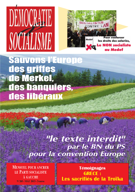 P.2 : informations, abonnements, agendaP.3 : éditorial : Gouvernement rouge, rose, vertP. 4 à 10 : Convention Europe du Parti Socialiste : le texte interdit et les amendements de Maintenant la gauche/D&S et Un monde d’avanceP. 11 à 13 : Comparaison entre l’ANI 11 janvier, le projet du 6 mars et la « petite loi » du 9 avrilP. 13 : Amnistie socialeP. 14 et 15 : Projet de loi bancaire - Une loi de non-assistanceP. 16 et 17 : Les services publics suici- dairesP. 18 : La crise de l’Euro, une crise socialeP. 19 : Abolir la prostitution - Les nôtresP. 20 et 21 : Grèce - Les sacrifiés de la TroïkaP. 22 : Internationales - Déconstruire le mythe ThatcherP. 23 : Post-it Palestine : Le Tribunal Russel sur la PalestineP. 24 : Rencontres de Toulouse avec le mensuel D&S Abonnez-vous et abonnez vos camarades à D S