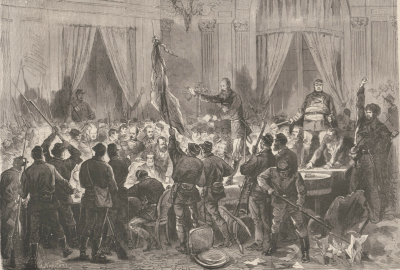 À l’annonce dans la capitale de la reddition de l’armée impériale à Sedan, la foule se rassemble autour du Palais Bourbon et, menée par les leaders de l’opposition démocrate à l’Hôtel de Ville, proclame la République. Au dire de Jules Ferry, « il y avait des fleurs aux fusils, des guirlandes ; c’était un air de fête dans la cité. Jamais révolution ne se fit avec une telle douceur »1. L’Empire, privé de son sabre, tombe sans coup férir, lâché par ses propres troupes qui ne trouvaient rien à redire au changement de régime. Selon l’historien Jean-Marie Mayeur, « l’hypothèse d’une régence ne trouv[a] pas de défenseurs au sein du Corps législatif », incapable de « proposer une issue politique au vide qui s’ouvr[ait] »2.