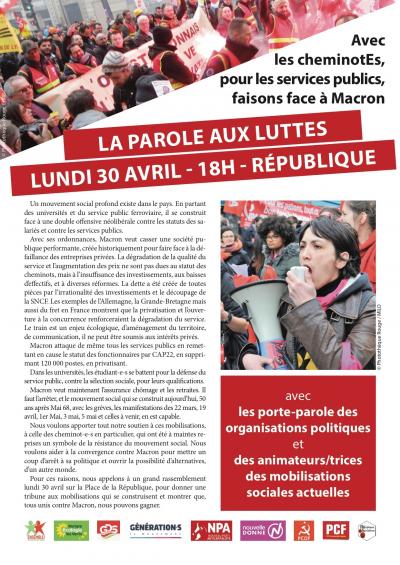 Une dizaine d’organisations et mouvements de gauche, dont la Gauche démocratique et sociale (GDS), ont entamé un travail de soutien à la lutte des cheminots, et en défense des services publics. De nouvelles initiatives sont en préparation (notamment le 30 avril à Paris à 18h place de la République, il faut multiplier ces actions unitaires sur tous les territoires.