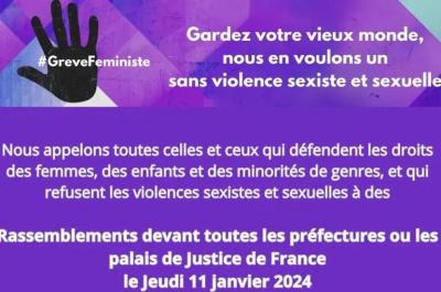 Nous appelons toutes celles et ceux qui défendent les droits des femmes, des enfants et des minorités de genres, et qui refusent les violences sexistes et sexuelles à des rassemblements devant toutes les préfectures ou les palais de Justice de France le Jeudi 11 janvier 2024 à 18h.