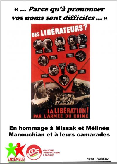 Nous reproduisons ici un hommage à Missak et Mélinée Manouchian et à leurs camarades, publié en Loire-Atlantique par les camarades d'Ensemble! et de la Gauche démocratique et sociale (GDS). Leur 4 pages est à retrouver en cliquant ICI .