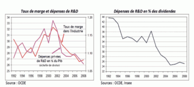 Télécharger le rapport[/caption] Certes, les aspects compétitivité hors-prix, c’est-à-dire liés à la qualité des produits, leur degré d’innovation technologique, l’adaptation à la demande… ne sont pas totalement ignorés. Il serait difficile en effet de ne pas voir, si on en reste à la comparaison avec l’Allemagne, le niveau insuffisant de la R&D en France : 2,1 % du PIB contre 2,8 %. Ce différentiel est également très marqué si l’on considère les dépenses en R&D du secteur privé : 15 milliards d’euros de ce côté-ci du Rhin, contre 31 milliards de l’autre en 2008. De même,tout le monde s’accorde pour pointer le problème des rapports entre les grands groupes industriels et leurs sous-traitants. L’externalisation des activités des grandes firmes a uniquement pour objectif de faire baisser les coûts en les reportant sur les PME sous-traitantes, multipliant ainsi les pratiques abusives. La dépendance par rapport aux grands groupes, qui peuvent les abandonner pour accroître leur rentabilité, explique en partie la difficulté des PME à avoir accès au crédit bancaire. Sur ces points aussi, la différence avec l’Allemagne est patente. Enfin, la sensibilité des exportations françaises au taux de change de l’euro est largement connue. Entre janvier 2002 et avril 2008, l’euro s’est réévalué de 78 % par rapport au dollar. Conséquence, depuis 2002 cette hausse aurait freiné les exportations françaises à la hauteur de 0,3 point en moyenne par trimestre. Le contraste est manifeste avec l’Allemagne qui, se situant sur des créneaux haut de gamme, est moins sensible aux variations de prix. Ces faiblesses de l’industrie française, si elles ne sont pas ignorées, sont de, fait, laissées de côté par la plupart des commentateurs. Les résultats du commerce extérieur sont mobilisés pour dramatiser la situation sans que jamais la validité des chiffres ne soit elle-même interrogée. Ainsi, la stratégie des firmes dans la mondialisation n’est que très rarement évoquée. Le redéploiement des processus productifs a pour conséquence une différence croissante, et variable selon les pays, entre la compétitivité d’un espace national et celle des firmes « nationales ». Dans le cas des firmes allemandes, la sous-traitance internationale est utilisée systématiquement, mais la phase finale d’assemblage se fait en Allemagne. Une part importante des exportations allemandes correspond donc, en fait, à du simple réexport pour une bonne partie du produit fini. A contrario par exemple, les importations vers la France des « Logan » produites dans les usines Renault de Roumanie sont comptées comme exportations roumaines. La contribution à la performance du pays peut se dégrader à partir du moment où les firmes réalisent une partie croissante de leur chiffre d’affaires à l’étranger. C’est le cas des grands groupes français, dont le chiffre d’affaires réalisé en France augmente très lentement, toute la croissance se faisant en Europe et dans le reste du monde. Ce phénomène de croissance sur le marché mondial peut se combiner avec l’utilisation des prix de transfert entre sociétés membres d’un même groupe, de manière à localiser le bénéfice final dans un pays à fiscalité avantageuse, voire dans un paradis fiscal. Rappelons que le commerce entre filiales d’un même groupe représente environ un tiers des échanges de la France. Les statistiques des exportations nationales s’en trouvent donc largement biaisées. Ainsi, plus de la moitié du déficit commercial de la France vis-à-vis de l’Allemagne (10 milliards d’euros) serait due à une manipulation des prix de transferts.