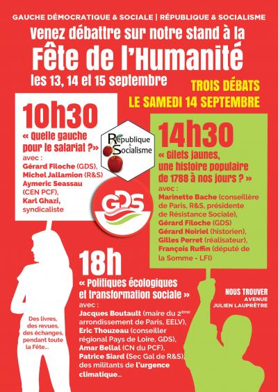 La fête du journal L’Humanité est l’occasion de débattre entre toutes les sensibilités de la gauche, comme nous le ferons, par exemple, avec François Ruffin au stand que la Gauche démocratique et sociale (GDS) tiendra en commun avec nos amis de République et Socialisme (RS). Trois débats y seront organisés samedi 14 septembre :