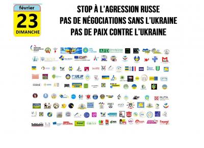 C’est pourquoi, nous, associations ukrainiennes et françaises engagées depuis février 2022 et parfois même depuis 2014 aux côtés de l’Ukraine résistante, vous appelons à manifester partout en France, autour du 24 février, date « anniversaire » de l’invasion à grande échelle, Retrouvons-nous partout en France où des initiatives solidaires (rassemblements, défilés, débats publics, concerts, expositions…) sont organisées et notamment à Paris le dimanche 23 février à 14h Place de la République.
