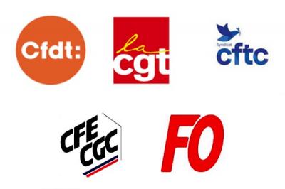 Sophie Binet, secrétaire générale de la CGT ; Cyril Chabanier, président de la CFTC ; François Hommeril, président de la CFE-CGC ; Marylise Léon, secrétaire générale de la CFDT ; Frédéric Souillot, secrétaire général de FO.