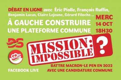 Pour en débattre, Démocratie et Socialisme, la revue mensuelle de la Gauche démocratique et sociale (GDS) organise une réunion publique en ligne, diffusée sur Facebook et Youtube le mercredi 14 octobre à 18h30. Eric Piolle (maire EELV de Grenoble), François Ruffin (député LFI), Benjamin Lucas (Génération.s), Claire Lejeune (ex co-secrétaire des jeunes écolos), Gérard Filoche (GDS) ... et d'autres intervenants répondront à la question : « A gauche, construire une plateforme commune : mission impossible ? ».
