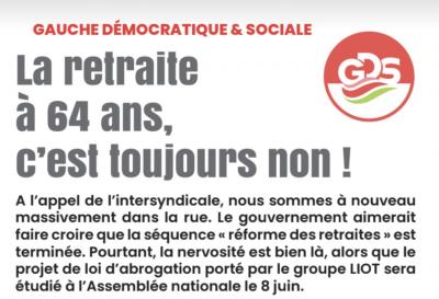 Gauche Démocratique & Sociale La retraite à 64 ans, c'est toujours non ! (Tract GDS) 02/06/2023 | redaction Tweet Nous mettons en ligne nos tracts à diffuser largement durant les manifestations du 6 juin 2023 Téléchargez la version couleurs Téléchargez la version noir et blanc