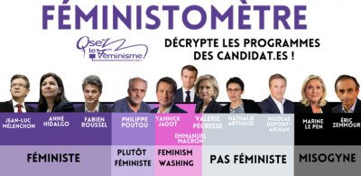 Ce « Féministomètre », publié par l’association féministe à l’occasion du 8 mars, a décrypté tous les programmes. Celui d’Emmanuel Macron n’étant pas publié à l’époque, Osez le féminisme s’est appuyé sur son bilan. Il « parle de lui-même : lors de son mandat, il a pratiqué un féminisme de façade. La “grande cause du quinquennat” annoncée n’a pas été suivie de mesures fortes. Énormément de fausses promesses, mensonges et effets de communication non suivis de moyens ont déçu les féministes. Les mesures économiques libérales ayant été adoptées ont pénalisé les femmes. […] Les victoires féministes de ces cinq dernières années lui ont été arrachées par les associations en lien avec des parlementaires allié.es. »