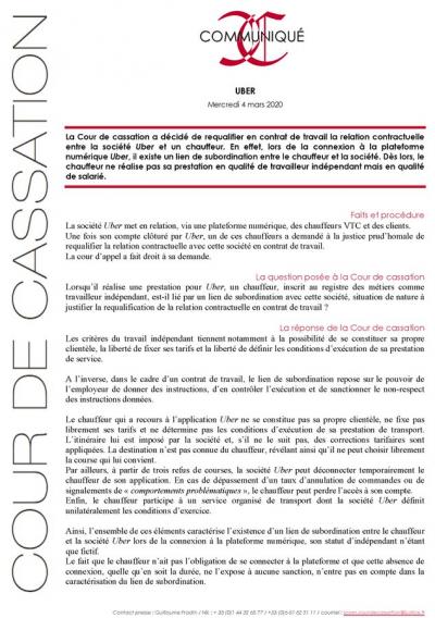 L’arrêt de la Cour de cassation du 4 mars est clair : « Lors de la connexion à la plateforme numérique Uber, il existe un lien de subordination entre le chauffeur et la société. Dès lors, le chauffeur ne réalise pas sa prestation en qualité de travailleur indépendant mais en qualité de salarié ».
