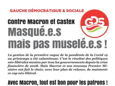 Gauche Démocratique & Sociale Contre Macron-Castex, masqué.es mais pas muselé.es 15/09/2020 | la rédaction Tweet Nous mettons en ligne nos tracts à diffuser largement durant les manifestations du 17 septembre. Téléchargez la version couleurs Téléchargez la version noir et blanc