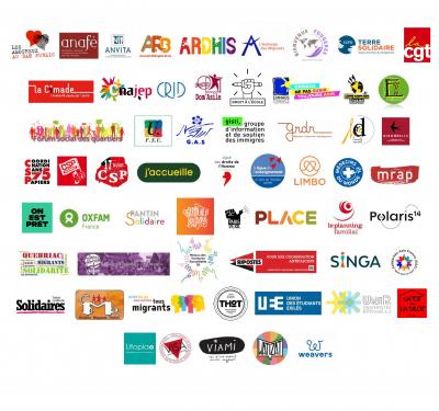 Organisations nationales :Les Amoureux au ban public / Anafé / ANVITA / Ardhis / CCFD-Terre Solidaire / CGT / La Cimade / CNAJEP / CRID / Dom'Asile / Emmaüs / Femmes Egalité / FSU / Gisti / Grdr - Migrations-Citoyenneté-Développement / Humanity Diaspo / J’Accueille / LDH / Ligue de l’Enseignement/ Limbo / Médecins du Monde / MRAP / On Est Prêt / Oxfam / Patrons Solidaires / PLACE Network / Planning Familial / Polaris 14 / Réseau Féministe « Ruptures » / Ripostes, pour une coordination antifasciste/ SAF (Solidarités Asie France) / Singa / Thot/ UEE / Union syndicale Solidaires / UniR Universités & Réfugié.e.s / Utopia 56 / Visa – Vigilance et initiatives syndicales antifascistes / Watizat / Weavers