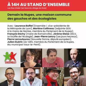 Avec : Laurence Boffet (Ensemble !, vice-présidente de la Métropole de Lyon), Marlène Collineau (adjointe GDS à la maire de Nantes, membre du Parlement de la Nupes), François Dechy (maire de Romainville), Jérôme Gleize (EELV, Le Souffle de l’écologie), Jean-Pierre Lancry (Les jours heureux), Pierre Larroutourou (Nouvelle Donne, député européen), Julien Guérin (ex-GRS, membre du Parlement de la Nupes, élu municipal Vaux-le-Penil).