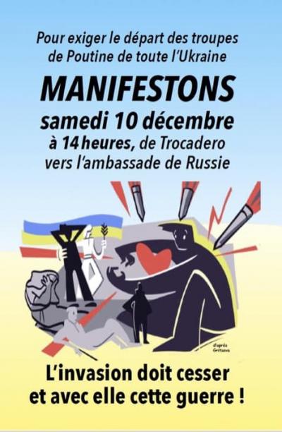 Samedi 10 décembre 2022 à 14 heures Parvis des droits de l’homme Place du Trocadéro en direction de l’ambassade de la Fédération de Russie à Paris pour exiger le départ des troupes de Poutine de tout le territoire de l’Ukraine !
