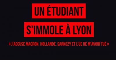 Vendredi 8 novembre 2019, un étudiant de 22 ans, militant de Sud Etudiant-e-s, s'est aspergé d'essence et s'est enflammé devant le Crous de Lyon. Il a laissé une lettre qui explique les raisons de son geste. Il est actuellement hospitalisé dans un état critique. Nous souhaitons apprendre que son état s'améliore.