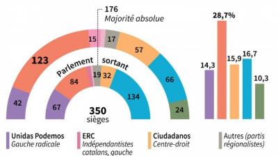 En sièges, la victoire est plus nette, puisque la gauche passe de 149 à 165 députés. Mais, avec ce score, elle n’atteint pas la majorité absolue (176 sur 350). La mise en place d’un gouvernement dirigé par le PSOE dépend du soutien – ou de l’abstention – des élus indépendantistes catalans (22) et/ou des autonomistes basques (10).