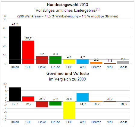 Le verdict des urnes est tombé. Le gouvernement sortant a été battu, mais Merkel triomphe ! Le bloc Union et le SPD sont les deux seuls partis à progresser en voix et en sièges. Les populistes anti-Euro manquent l'entrée au Bundestag pour 90 000 voix, le FDP libéral le quitte pour la première fois dans son histoire pour 30 000 voix.La Gauche a la majorité absolue en sièges, mais nécessite une refondation complète ; le projet SPD-Verts échoue à construire une majorité, le positionnement des Linke et par rapport aux Linke est au cœur de la refondation à venir.