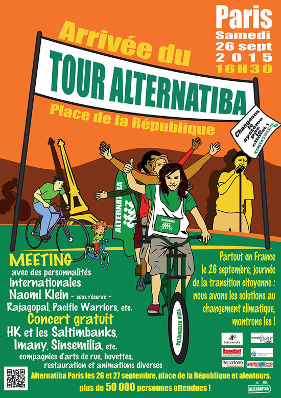 Une vraie mobilisation citoyenne est en route. Elle connaîtra un premier point culminant avec les journées du 26 et 27 septembre 2015 (arrivée du Tour Alternatiba, Alternatiba Paris qui vise à rassembler plus de 50 000 personnes, journée de la transition pour le climat...).