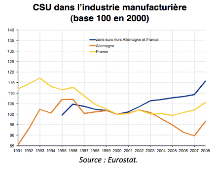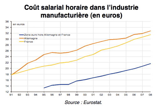 Cette idée repose pourtant sur un préalable qui ne semble pas confirmé dans les faits. Si l’on ne regarde que le coût salarial horaire dans l’industrie manufacturière et son évolution respective en Allemagne et en France on constate avec le graphique 7 que l’Allemagne est légèrement au-dessus de la France avec un coût horaire de 33 euros contre 31 euros en 2008. Ces deux pays se situant par ailleurs bien au-delà du niveau moyen de la zone euro située à 20 euros.