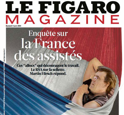 La une du Figaro Magazine était à refaire. Non, vraiment, ce n'était pas possible, ce jeune fainéantant sur ce hamac aux couleurs du drapeau français, représentant le chômeur fantasmé par la bourgeoisie : 466,99 €/mois, repu et insouciant... Heureusement, l'actualité vint à point, et l'on apprit que Luc Ferry était payé 4499,00 €/mois par l'université Paris VII, sans qu'il ne travaille. Luc Ferry passe-t-il ses journées à philosopher dans son sofa ? Mystère. Mais avec un si bel exemple, la une sur la France des assistés est tout de suite beaucoup plus réaliste !