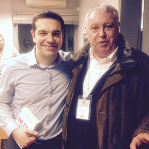 Photo (haut) : Gérard Filoche félicite Alexis Tsipras, le 25 janvier 2015, et lui remet un exemplaire de son ouvrage La Dette indigne.